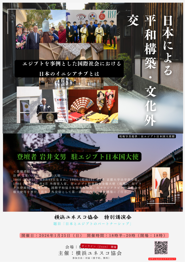 さて、横浜ユネスコ協会は1月25日(日)に岩井文男 駐エジプト日本国大使をお迎えして特別講演会を開催致します。
